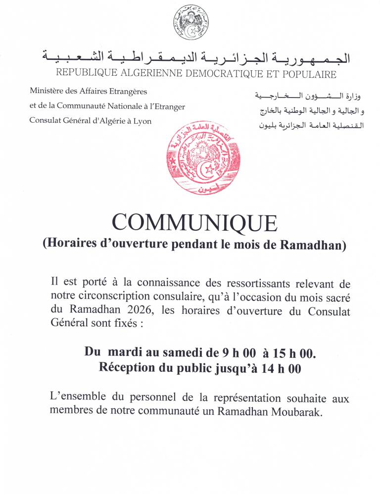 Horaires d’ouverture pendant le mois de Ramadhan